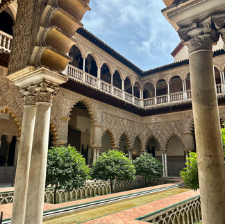 Moreover, the inside was beautiful. The intricate plaster carvings and tile designs (azulejos) in the Alcázar were created using a technique called “ataurique." Ataurique is a staple of Islamic art that uses repeating patterns of foliage, geometry, and calligraphy of the Arabic language. I had seen ataurique already in Morocco, and I tried making my own plaster carving in a class. I had one little square to do, and it took me 2 hours to finish half of it. The professionals, of course, finished theirs a little faster than I did, but it still shocked me to think about so much work being put into all of the walls in the Alcázar. As I often do, I fell behind the tour a little bit because I was continuously distracted and bewildered by these designs.